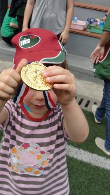 Dann hatte Mira Sporttag und erhielt eine Medaille. Sie war sehr stolz!!