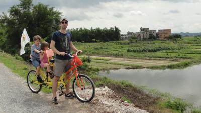 Am nächsten Tag ging es schon wieder früh los: Wir gingen auf eine Fahrradtour und fuhren mit Bambusbooten den Fluss hinunter. Wir sahen ein Kamel und ein Mann mit zwei Äffchen. Dann fuhren wir mit den Velos zu einem Restaurant. Nach dem Essen gingen wir in eine Höhle. Mira hatte etwas Angst. Eine neue Freundin von Mira (sie ist Teachers Assistant in der Utahloy Schule) schenkte ihr ein Spielzeug.